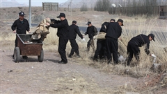 日前,矿山救援大队员工在清捡外围公路旁白色垃圾。…