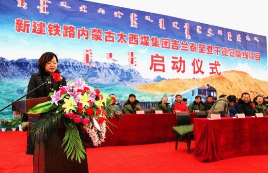董事长王以廷宣读新建铁路内蒙古太西煤集团吉兰泰至查干德日斯项目开工令;总裁王海霞向来宾欢迎致辞。