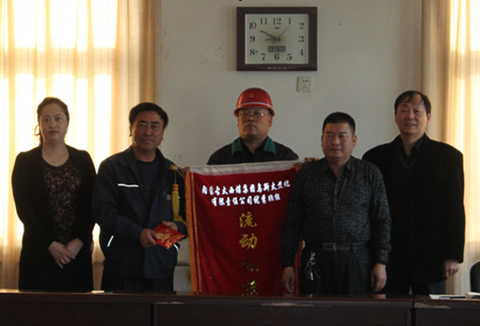 公司领导为考核得分第一名的炼焦车间备煤工段丙班颁发了流动红旗,并进行了现金奖励