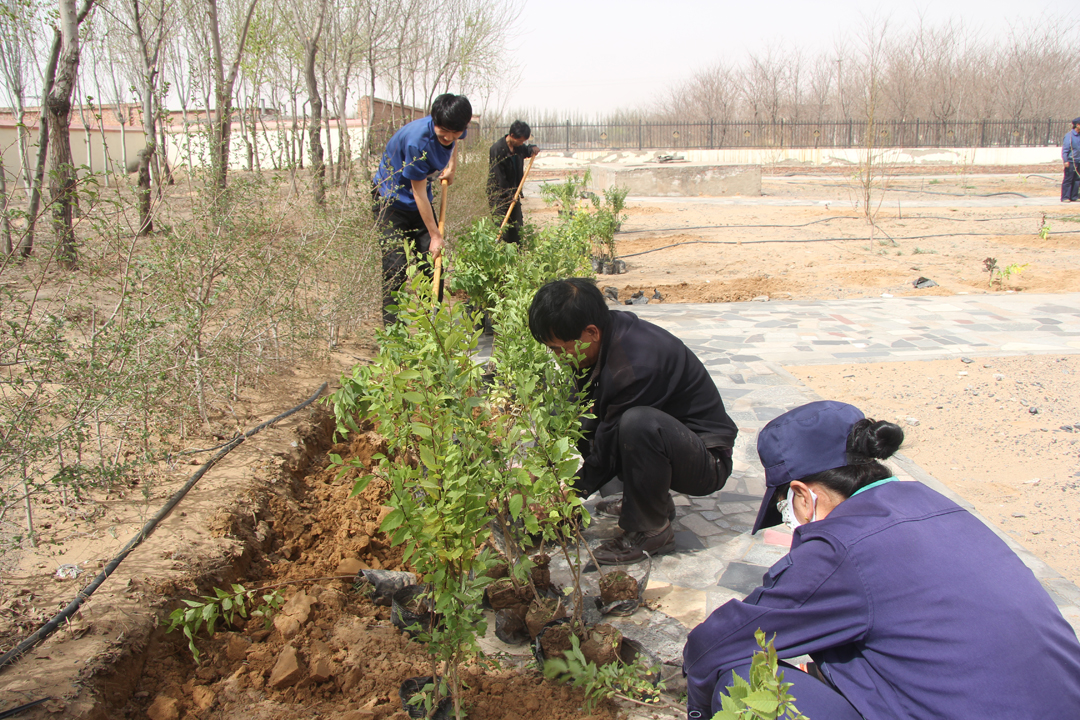 在办公大楼院内,广大员工挥锹挖坑、运送苗木、填土放苗,一片忙碌景象,大家团结协作,为美化公司环境尽一份力量。共计栽种花灌木