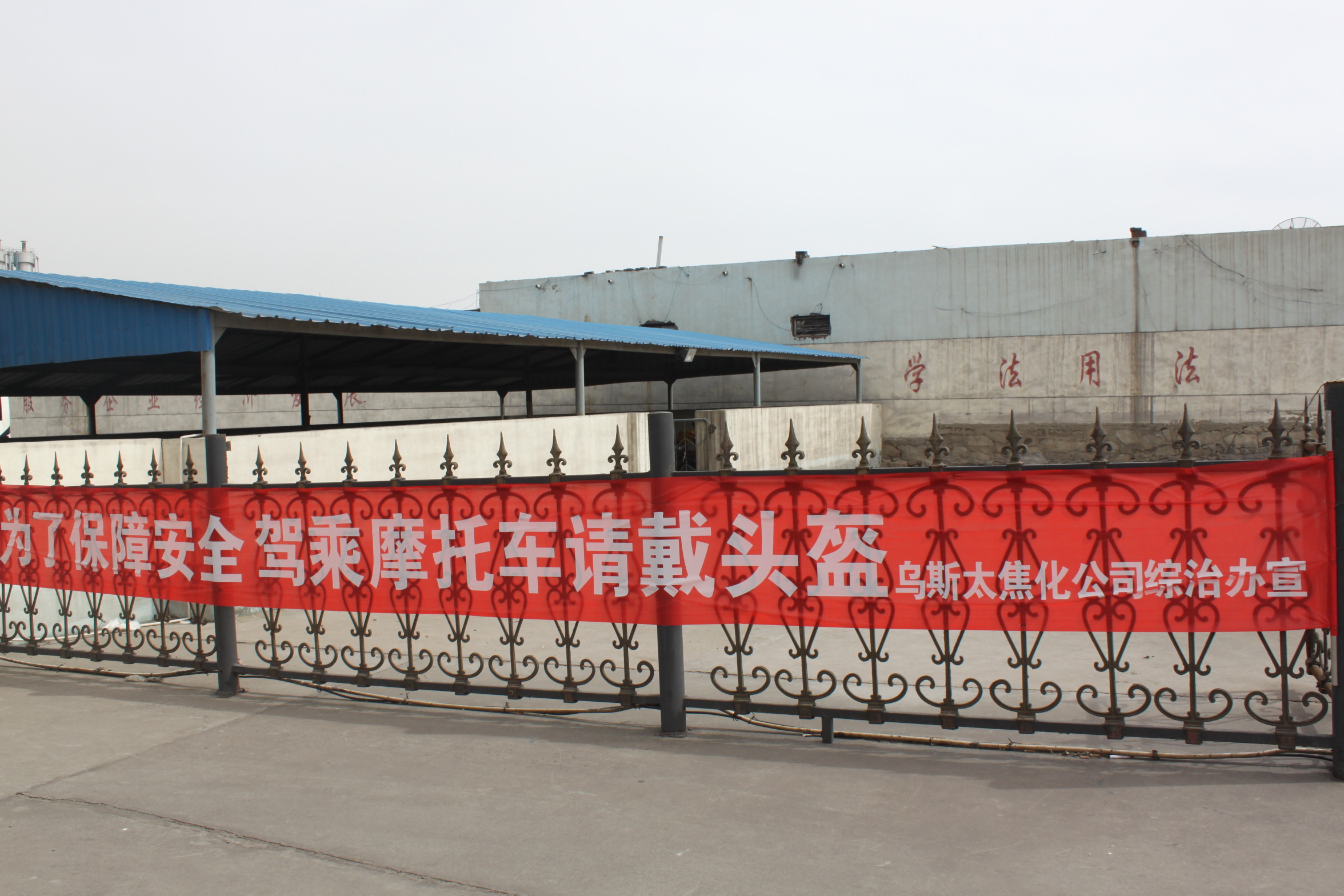 在乌斯太焦化公司西门停车场悬挂交通安全宣传横幅