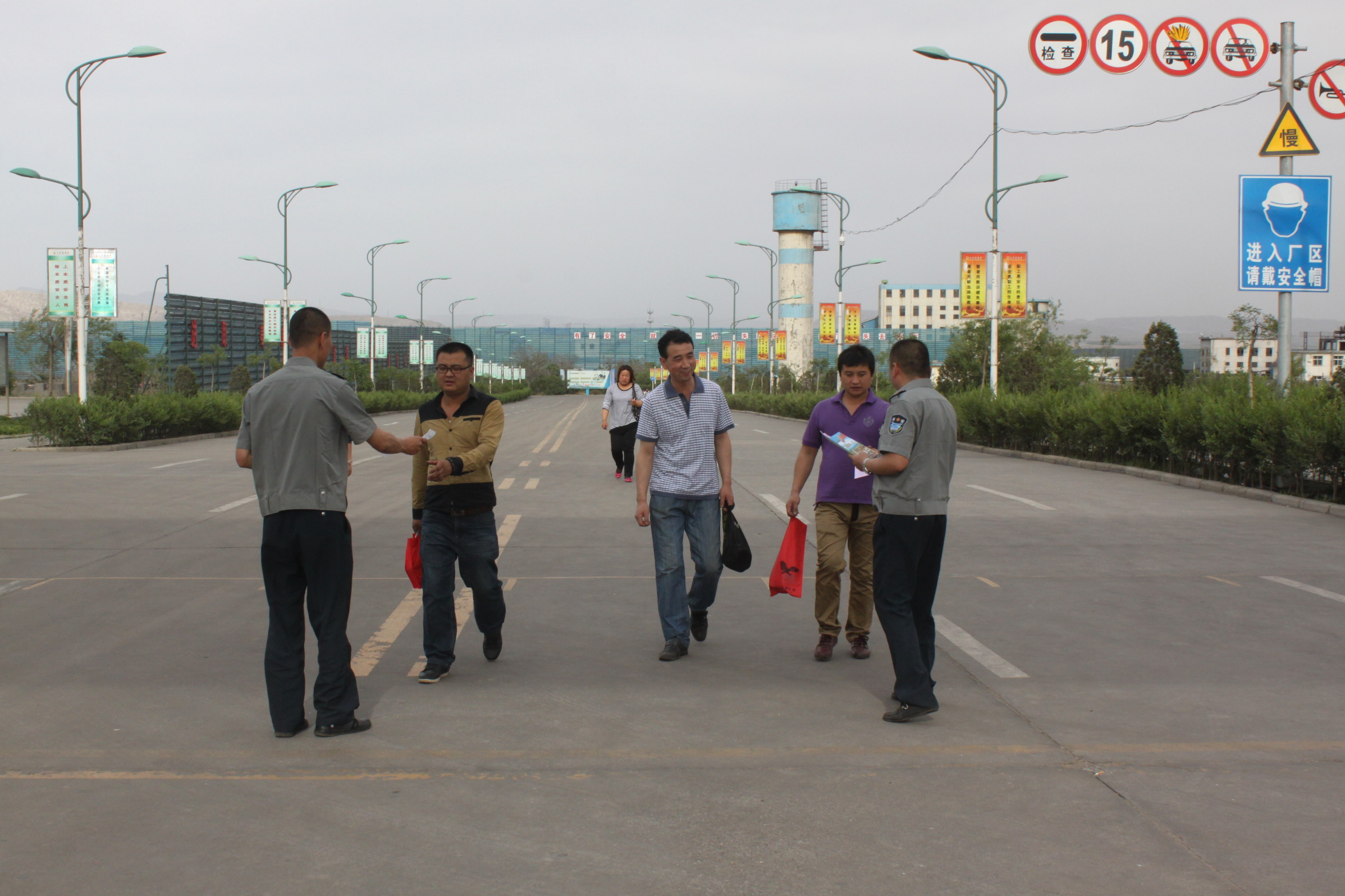 保安大队工作人员向员工发放交通安全宣传资料