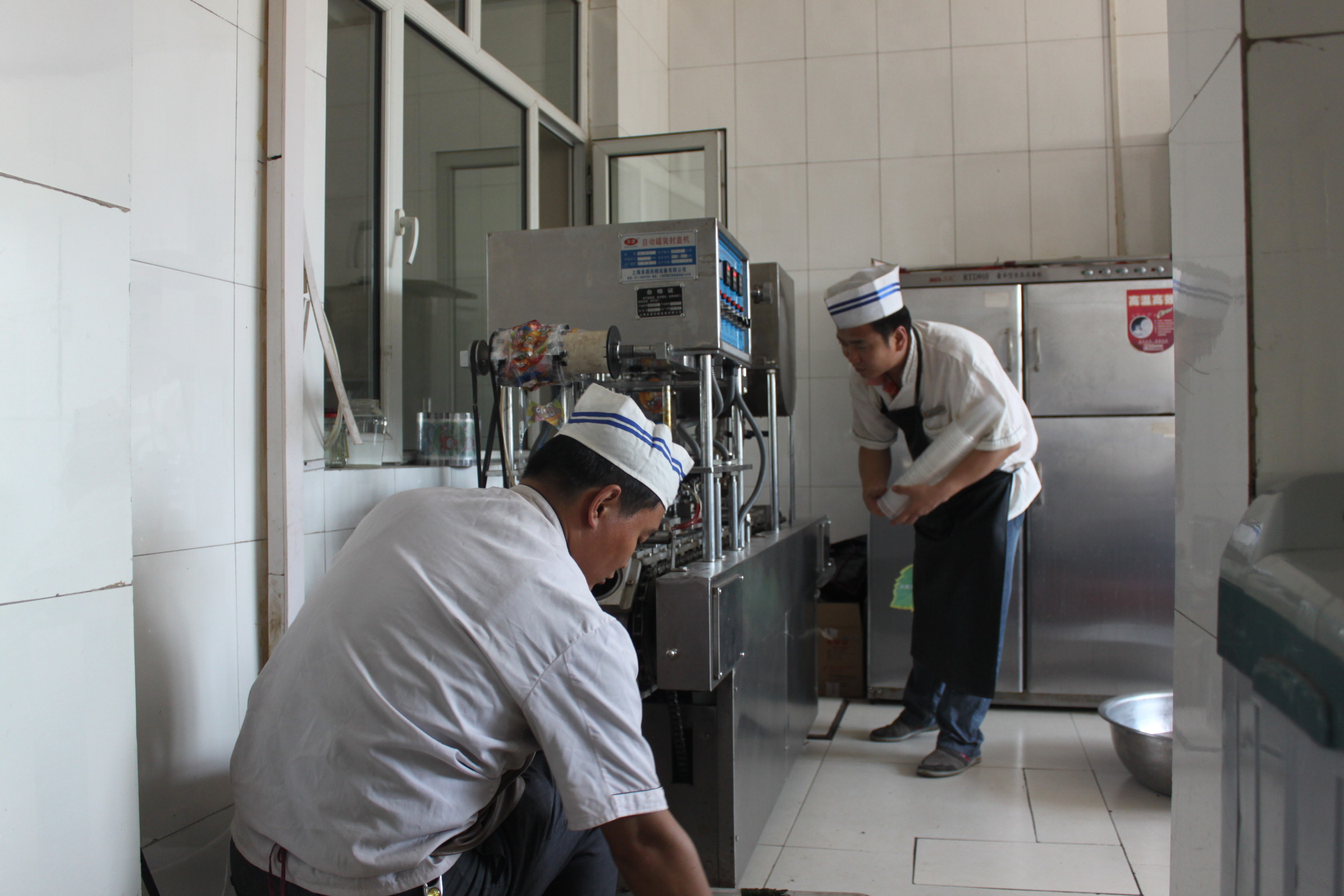 餐厅工作人员塑封绿豆汤忙绿中