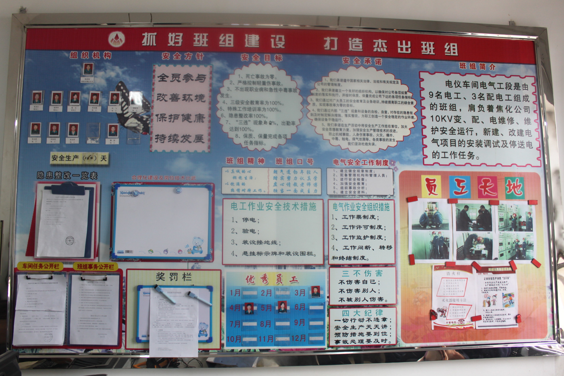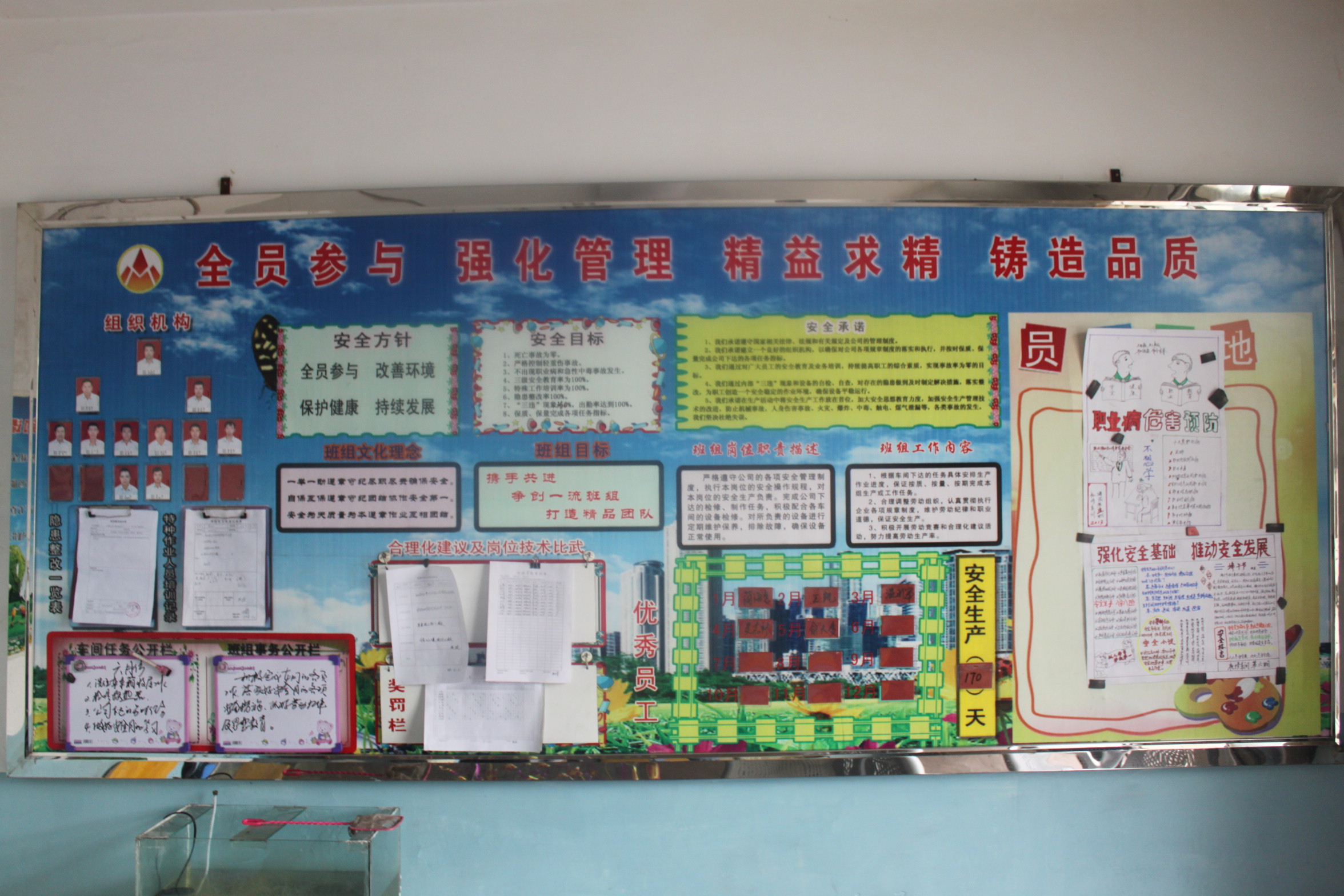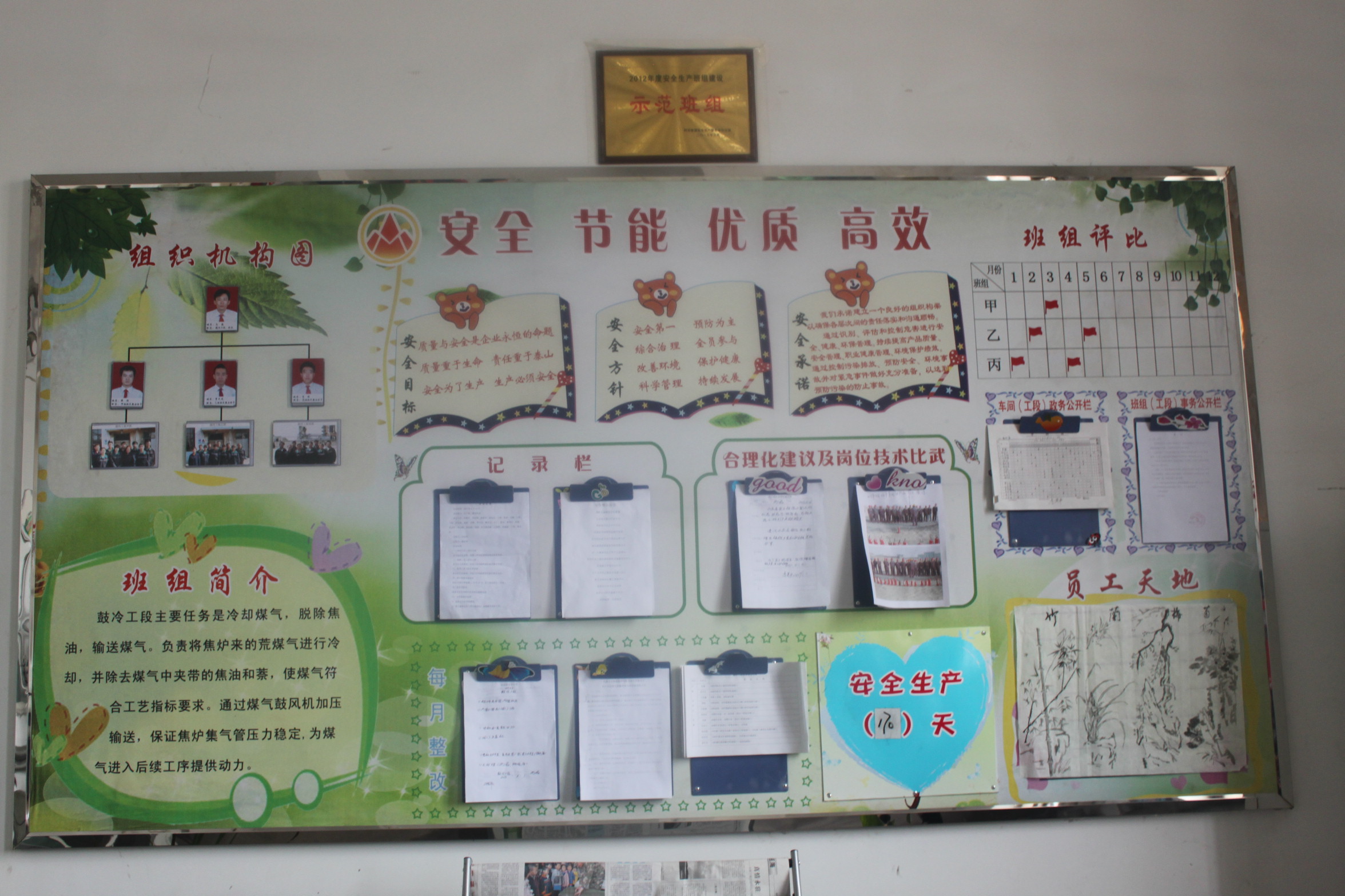 自开展班组安全建设工作以来,乌斯太焦化公司以“打造杰出班组”为目标,以班组文化建设为主线,把创建学习型组织、班组安全文化建设、创先争优等有机结合起来,开展了班组文化“上墙”活动。班组“文化墙”作为企业和班组整体素质及精神面貌的一面镜子,根据各基层班组特点,以不同的形式展现了乌斯太焦化公司班组文化,其内容主要包含了:“企业安全目标”、“企业安全方针”、“企业安全承诺”“班组简介”、“班务公开”、“风险提示”、“违章曝光”、“知识角”、“工作计划与总结”和“员工天地”等专题栏目,通过员工自己动手参与,积极参与班组建设,把乌斯太焦化公司安全理念、班组各方面的最新动态及相关作业知识呈现给大家,有效地调动了班组职工创先争优积极性,为班组建设带来新的一缕风采。