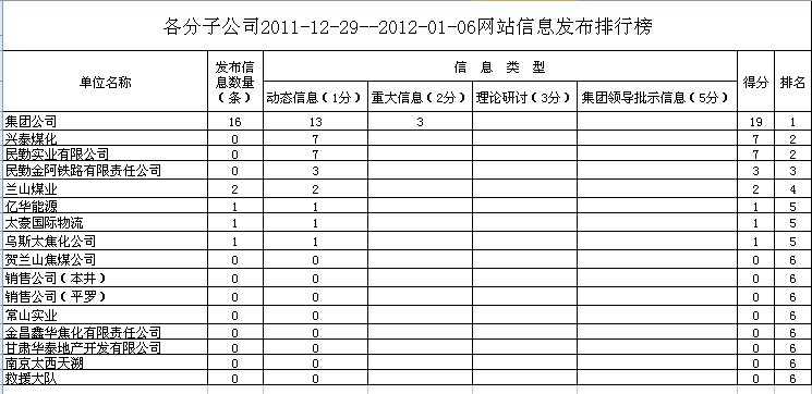 各分子公司2011-12-29--2012-01-06网站信息发布排行榜