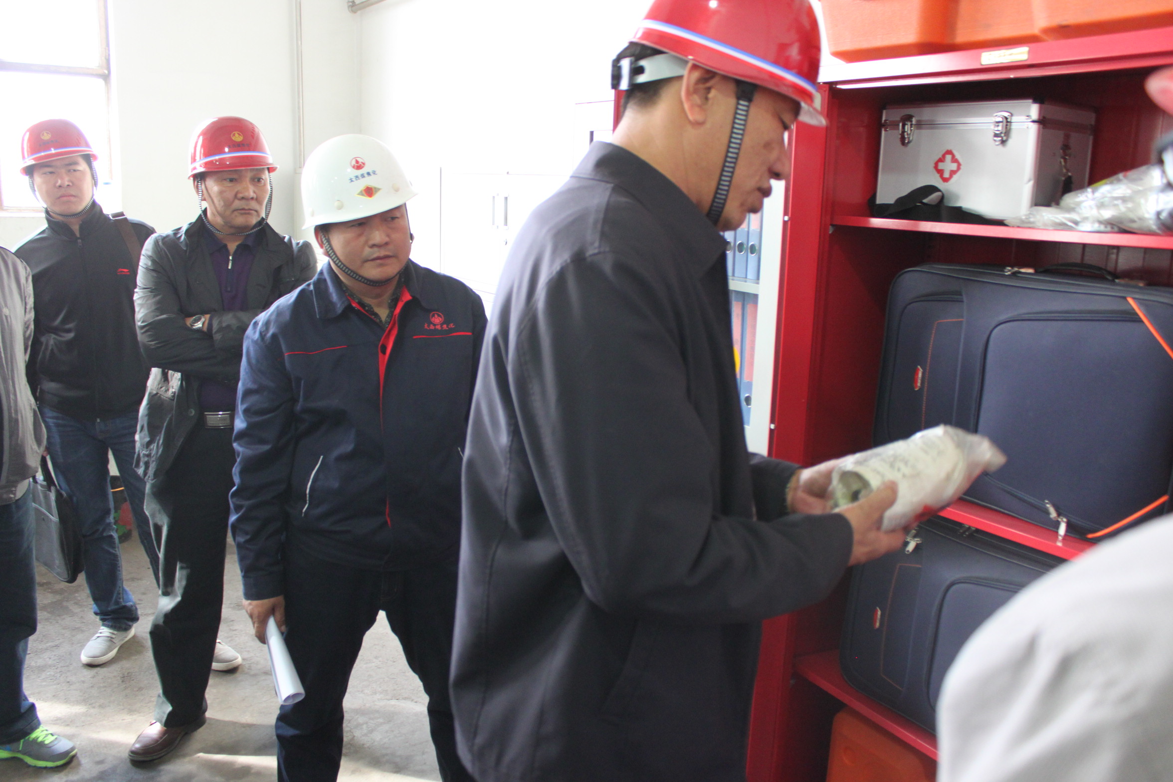 (安监局戴局长在仔细查看各班组安全防护用品)