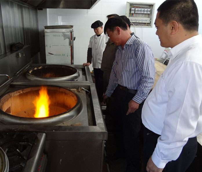太豪国际酒店工程部部长叶少华,正在酒店餐饮部监督技术人员,由液化气设备改造为醇基燃料设备过程的现场。