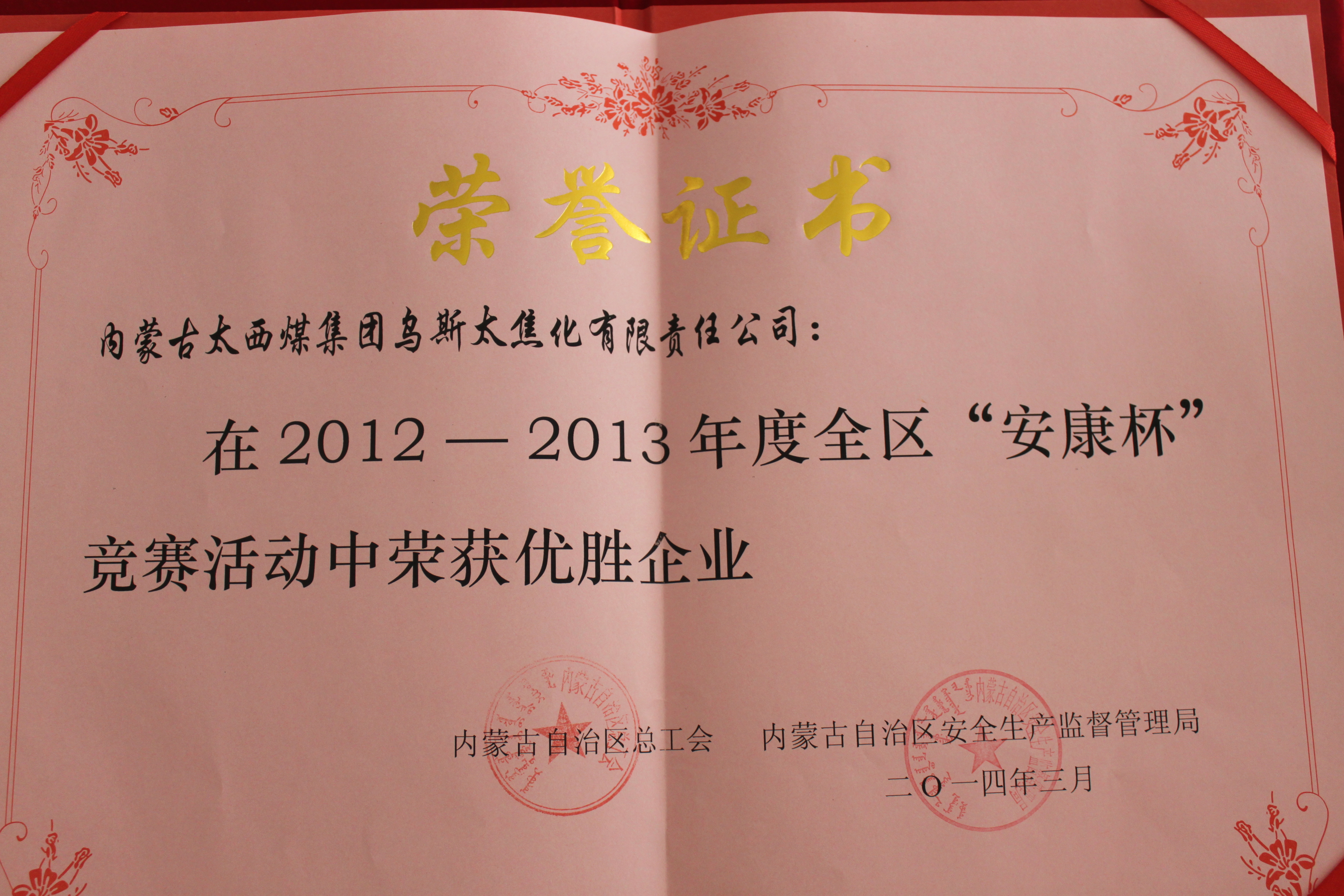 为贯彻落实“安全第一、预防为主、综合治理”方针,实现公司安全生产形势的稳定发展,推动公司建立和完善安全生产规章制度,我公司工会2013年按照盟工会、盟安全生产监督管理局、太西煤集团公司的总体要求,开展了“安康杯”竞赛活动,活动将竞赛机制、奖励机制、激励机制应用于安全生产活动中,不断增强公司全体员工人人重视安全、人人关心安全、人人遵章守纪的主动性、积极性和自觉性,最终实现全年安全生产零事故。日前喜获有内蒙古自治区总工会、内蒙古安全生产监督管理局评比颁发的2012-2013年度全区“安康杯”竞赛活动优胜企业荣誉证书,这是焦化公司继2013年获得自治区“安全文化建设示范企业”后又一殊荣。