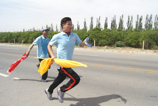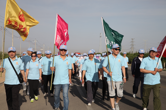 上午6点30分,全体队员着统一服装,按时到达活动现场,队旗迎风飘扬。活动开始前,各队都呐喊出了自己铿锵有力的宣言,随着董事长一声出发号令,四支队的队员沿着巴彦浩特环城北路迈开大步,浩荡向前。徒步行程中充盈着加油声、呐喊声,大家用汗水挥洒激情、释放快乐。