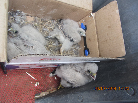 2014年7月6日上午,兴泰煤化公司保安大队同塔尔岭公安检查站民警在乌巴公路执勤过程中,发现三名骑摩托可疑男子,我公司保安人员及执勤民警示意摩托车进入处置区域进行详细检查和询问,对人员信息进行了核查,在检查过程中发现纸箱中装有三只小的野生动物鹰隼(鹰隼为国家一级保护动物,禁止买卖,掠杀)。我公司保安人员协助民警将嫌疑人带到塔尔岭公安检查站,经依法审查后,现已将嫌疑人及解救的三只鹰隼移交盟森林公安刑警队进一步调查处理。(图为解救的三只鹰隼)
