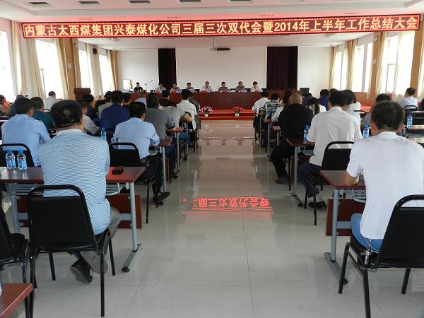 7月30日,兴泰煤化公司三届三次双代会暨2014年上半年工作总结大会顺利召开,圆满完成了会议的议程。会议听取了黃朝军总经理所作的《坚定信心 迎难而上 抢抓机遇 降本增效》行政工作报告、刘卫东副总所作的《2013年度财务决算报告》、工会主席祁玉萍同志所作的《加强建设 夯实基础 推动工会工作再上新台阶》的工会工作报告。