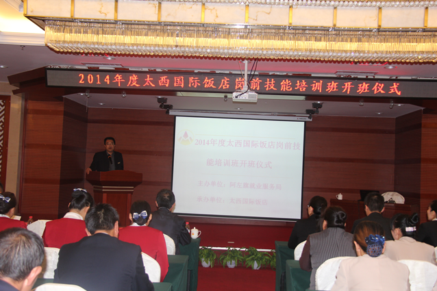 近日,“太西国际饭店2014年度岗前技能培训班开班仪式”在太西国际饭店多功能F厅隆重举行。本次培训由阿左旗就业管理局主办,太西国际饭店承办。阿左旗就业管理局相关领导、集团公司人力资源管理总部领导以及饭店特聘讲师出席了开班仪式。