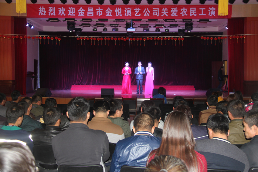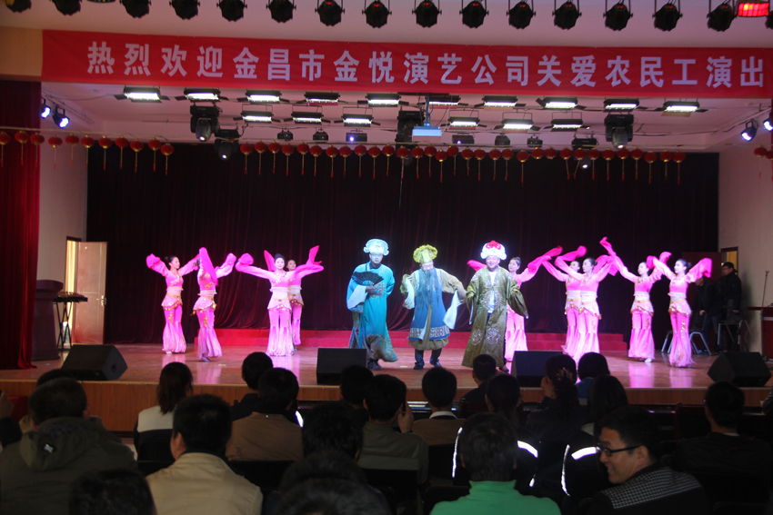 金昌市金悦演艺公司全体演职人员为企业职工及辛勤劳作的农民工兄弟倾情奉献了一场精彩的文化大餐,受到了企业职工及农民工朋友的热烈欢迎。