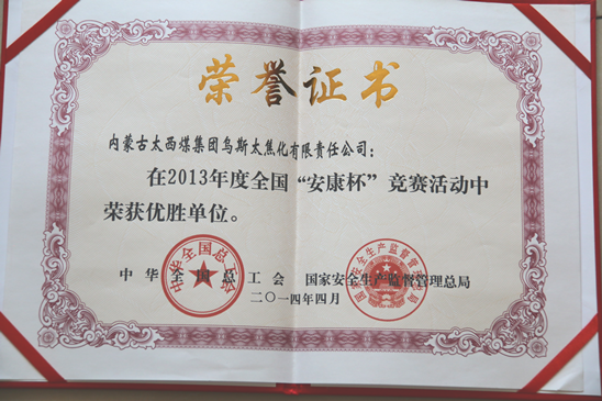 日前,乌斯太焦化公司荣获由全国总工会和国家安全生产监督管理总局评选的2013年度全国“安康杯”优胜企业荣誉称号。