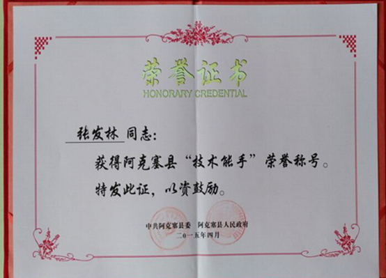日前,我公司生产部部长张发林被评为“阿克塞县技术能手”,全县仅5人获此荣誉。