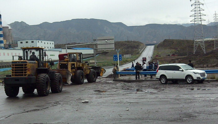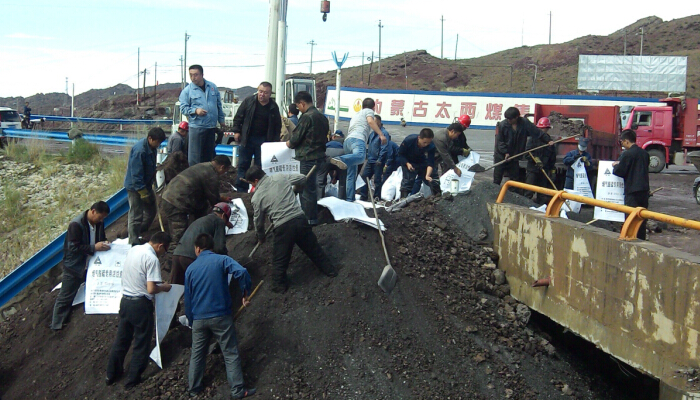 中午,公司员工发现生态湖东北侧的堤岸出现一个“涵洞”,湖内的水正通过“涵洞”汹涌外泄,入口处已形成一个直径一米半的漩涡,如决堤般的洪水在出口处奔腾外泄,同时还在不断的扩大。得知讯息后,一分厂厂长彭家宏紧急调动分厂内车辆前往现场进行封堵,多辆铲车和自卸车如军队救灾车辆,呼啸着赶往现场。公司员工也自发的带着铁锹、编织袋等工具赶往现场。一时间,各路人马,各种车辆都出现在生态湖决堤口。大家紧张有序,自发的三五个人一组,轮流装砂石,忙的热火朝天。