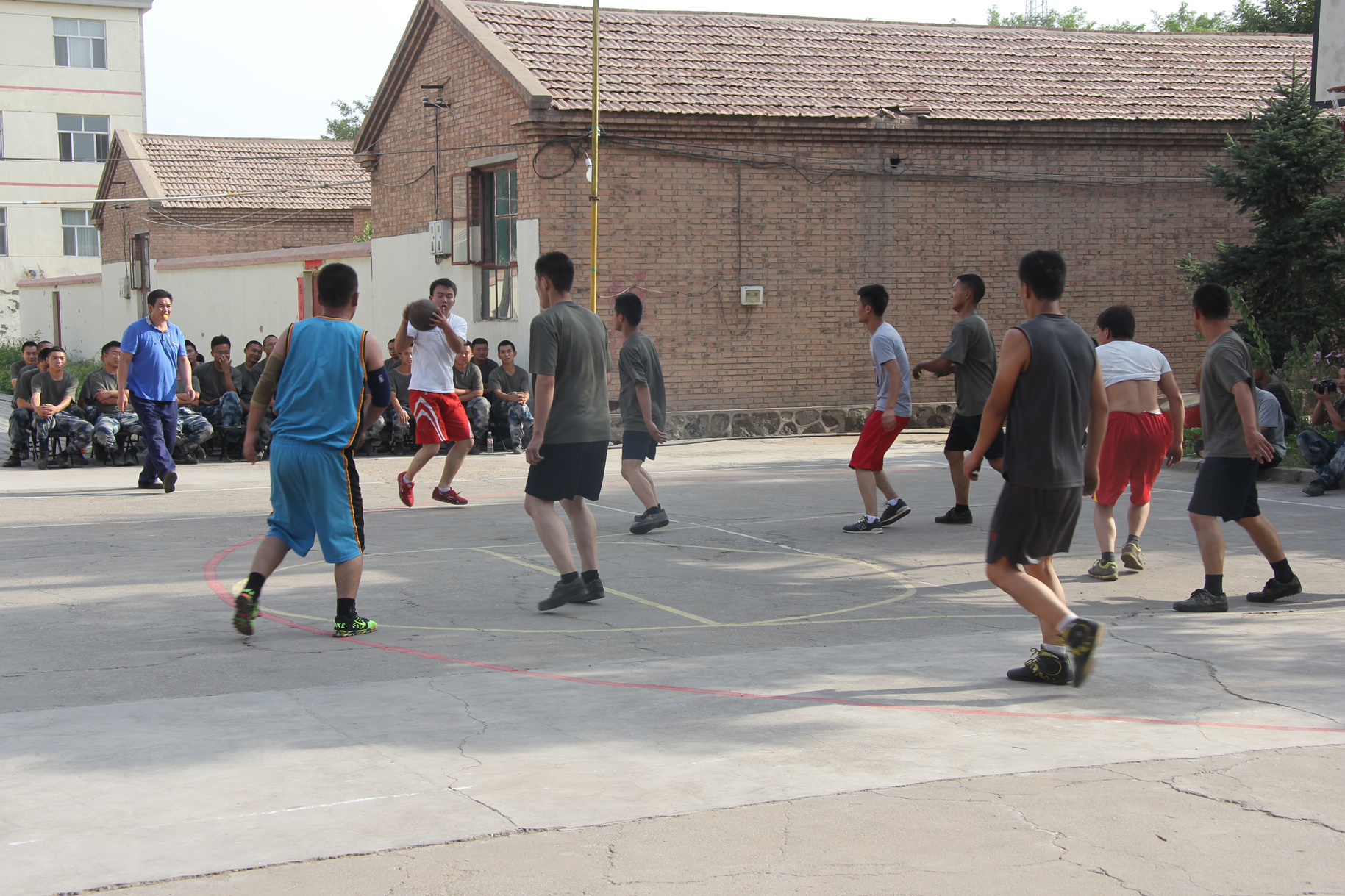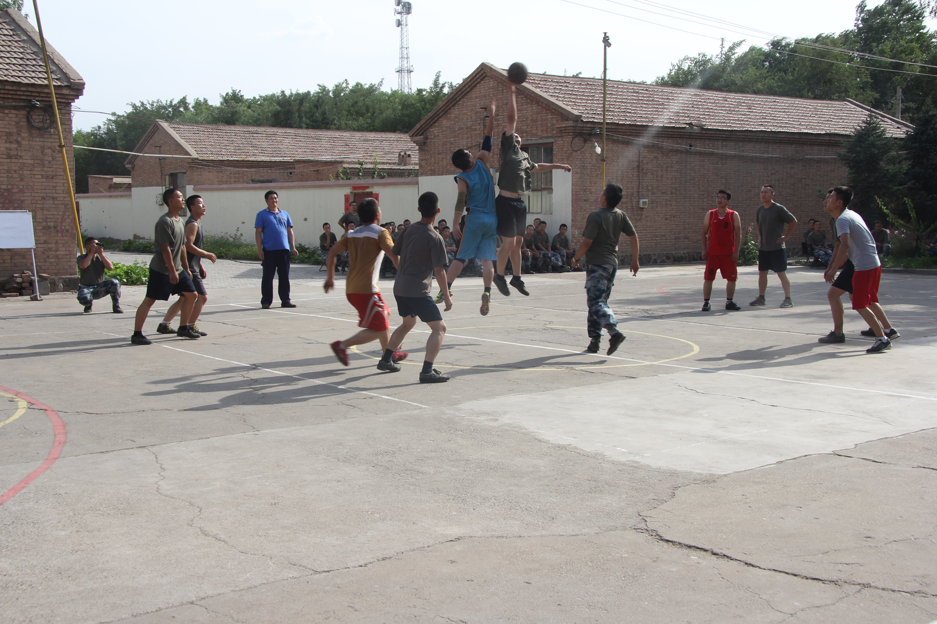 比赛分为四小节,每小节12分钟。一开始,93804代表队率先进入状态,中距离投篮、突破上篮、三分远投,以21:8取得良好开局。销售公司代表队的小伙子见对手年龄相仿,但打起球来一点都不含糊,且经验丰富,决定改变战术。一个短暂的暂停后,销售公司代表队小伙子们调整战术,以技术优势进行反攻,渐渐把比分追了上来。中场休息,销售公司代表队的体力不如部队官兵,但部队官兵在防守和技术上又不及销售公司篮球队,综合评比,部队官兵还是略胜一筹。第四节,部队官兵们利用身体优势和凶悍的防守,发动一轮又一轮快攻。销售公司代表队形势不容乐观。在随后的比赛中,销售公司代表队以扎实的篮球基本功为球队拉近比分打开了局面。最终,部队官兵代表队以较强的优势战胜销售公司球队。篮球场内你争我夺气氛异常紧张,场外观众拉拉队更是激情高涨,欢呼声、呐喊声、加油声、锣鼓声为比赛的球员们助威。