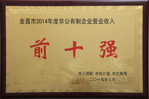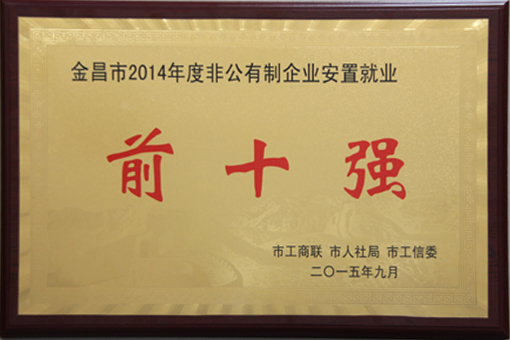 10月14日,中共金昌市市委、金昌市人民政府召开的2014年度非公有制企业营业收入、缴纳税收、安置就业“三个十强”新闻发布会,公布了2014年度非公有制企业“三个十强”名单。这是金昌市首次发布非公有制企业“三个十强”。内蒙古太西煤集团金昌鑫华焦化有限责任公司荣获金昌市2014年度非公有制经济营业收入第一名、安置就业第一名荣誉称号,甘肃省民营企业收入50强第31位、安置就业50强第39位。