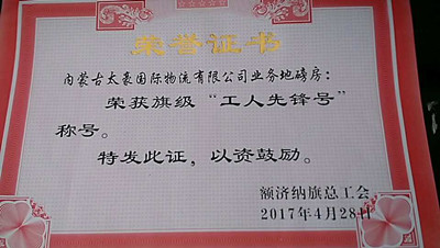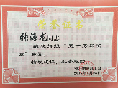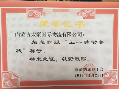 “五一”国际劳动节前夕,额济纳旗总工会隆重召开了额济纳旗庆祝“五一”国际劳动节暨表彰大会。大会表彰了一批为全旗经济社会发展作出突出贡献的先进集体和先进个人,太豪公司喜获三个“五一”劳动奖项,它们分别是:太豪公司获得旗级“五一劳动奖状”;公司业务部地磅房获得旗级“工人先锋号”;业务部铲车班班组长张海龙获得旗级“五一劳动奖章”。