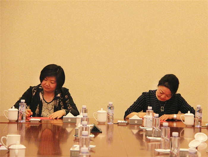 座谈会后,总裁与饭店总经理王丽丽签2017年度绩效考核责任状。