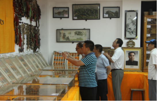其次,参观阿拉善红色收藏馆,展出藏品由内蒙古民间收藏大师马英、付有祥和曹别立格提供,展品分红色物品、民族民俗用品、连环画及期刊杂志三大类,包括各种各样的毛主席像章、红色读本、革命书籍,还有上个世纪五、六十年代的期刊杂志等共叁万多件。部分收藏品反映了阿拉善文化习俗和地域特征,传递着阿拉善的历史文化信息。在展厅里有一幅用1300多枚毛主席像章拼制而成的字幅,色彩斑斓的“为人民服务”几个大字格外吸引参观者的眼球。表达了我们对毛主席的敬爱之情。