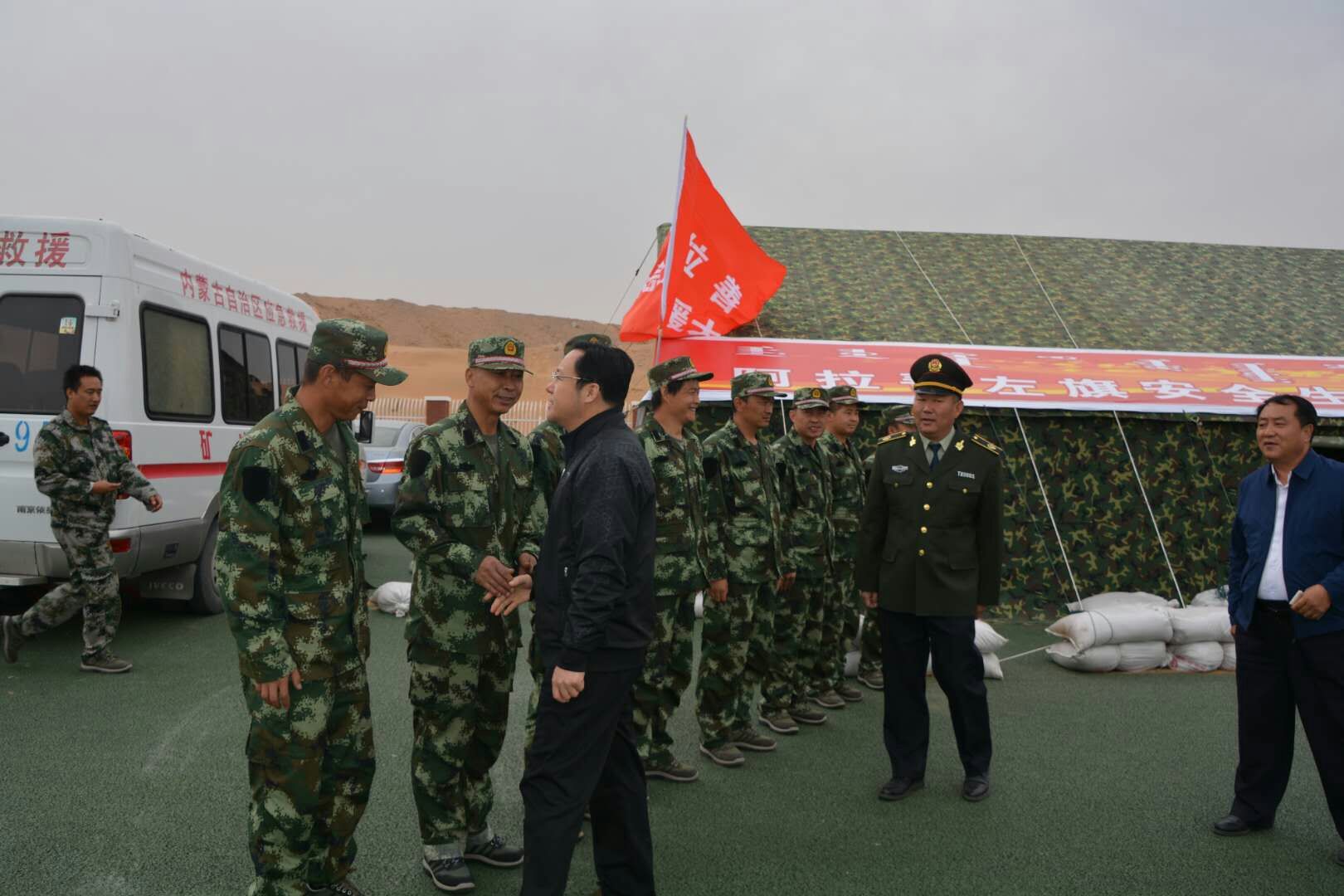 在双节期间,除做好矿区应急救援值班工作外,授阿拉善左旗安全生产监督管理局的指令 , 抽调一辆矿山救护车和 10 名矿山救护队员,携带灭火器、破拆装置及其它相应的救援装备,奔赴阿拉善英雄会安营扎寨,做好期间的应急救援工作。