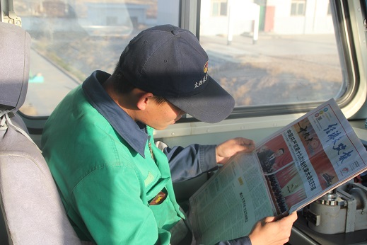 学习党的十九大报告已成为金阿铁路公司党员干部的自觉行动,图为一线员工正在通过报纸积极阅读党的十九大报告内容。
