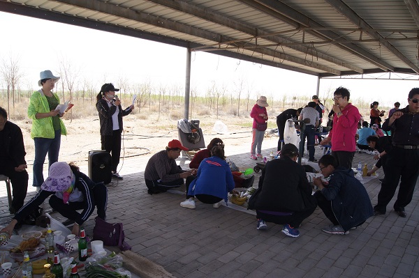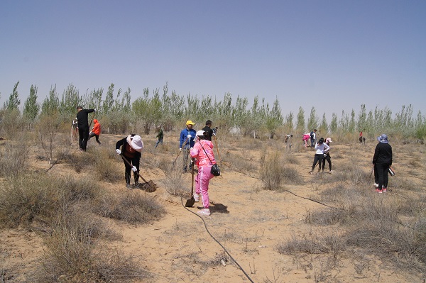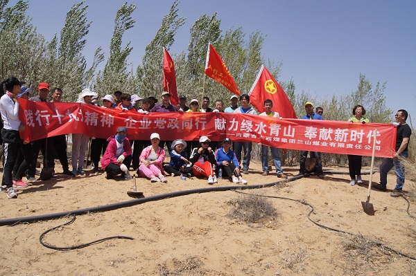 然后驱车到太西煤腾格里沙漠生态园,到达植树现场后,大家以事先分好的小组为单位,迫不及待地行动起来,挥锹挖坑,培土固沙,配合默契,一气呵成,现场一派热闹气象。植树完成后,展开野餐烧烤、游戏拓展,在此过程中,穿插了党的十九大精神和习近平重要讲话的学习宣读,大家积极参与,互相配合,合作竞争,现场气氛非常活跃,展现了拼搏的团队精神,环保意识贯穿活动全程,每个人都主动回收垃圾,不留一片污染物。