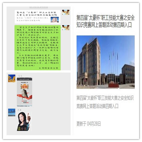 以往,各种安全学习教育主要以培训和现场竞赛为主,形式单一,组织难度大,大家学习热情不高。为此,太豪公司依托新媒体,在微信平台上发布竞赛题目,开展以“安全生产知识微信答题积分赛”为学习模式的知识竞赛,让职工足不出户就能参与竞赛,动动手指就能学到安全生产法律法规及岗位标准,作业流程等知识,形式新颖,时间自由,创新了广大职工的学习方式的同时为公司5月中旬举办的安全生产知识竞赛做好了预热工作。