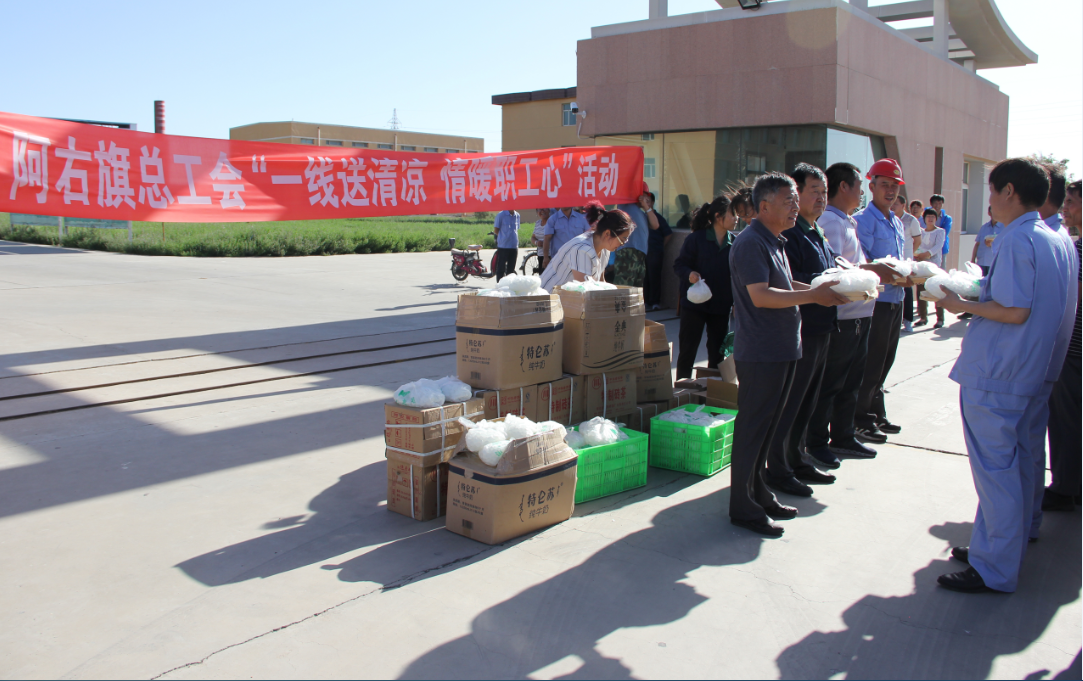 炎炎夏日送清凉,滴滴关怀暖人心。7月18日,阿右旗总工会领导莅临太西煤集团常山实业公司举行“一线送清凉、情暖职工心”活动,为奋战在高温一线的的职工朋友们送上了300多份冰糖、茶叶等防暑慰问品。在慰问中,旗总工会领导对高温酷暑天气下坚守岗位的一线职工表示敬意,同时叮嘱他们在工作时要注意防暑,保持充沛的精力投入到生产工作中。 一声声关切的问候,一句句深情的叮嘱,让奋战在高温下的一线员工倍感凉爽、备受鼓舞。大家纷纷表示,感谢旗总工会领导的关怀和厚爱,将以实际行动立足工作岗位,做好本职工作,保证各项工作任务完成。