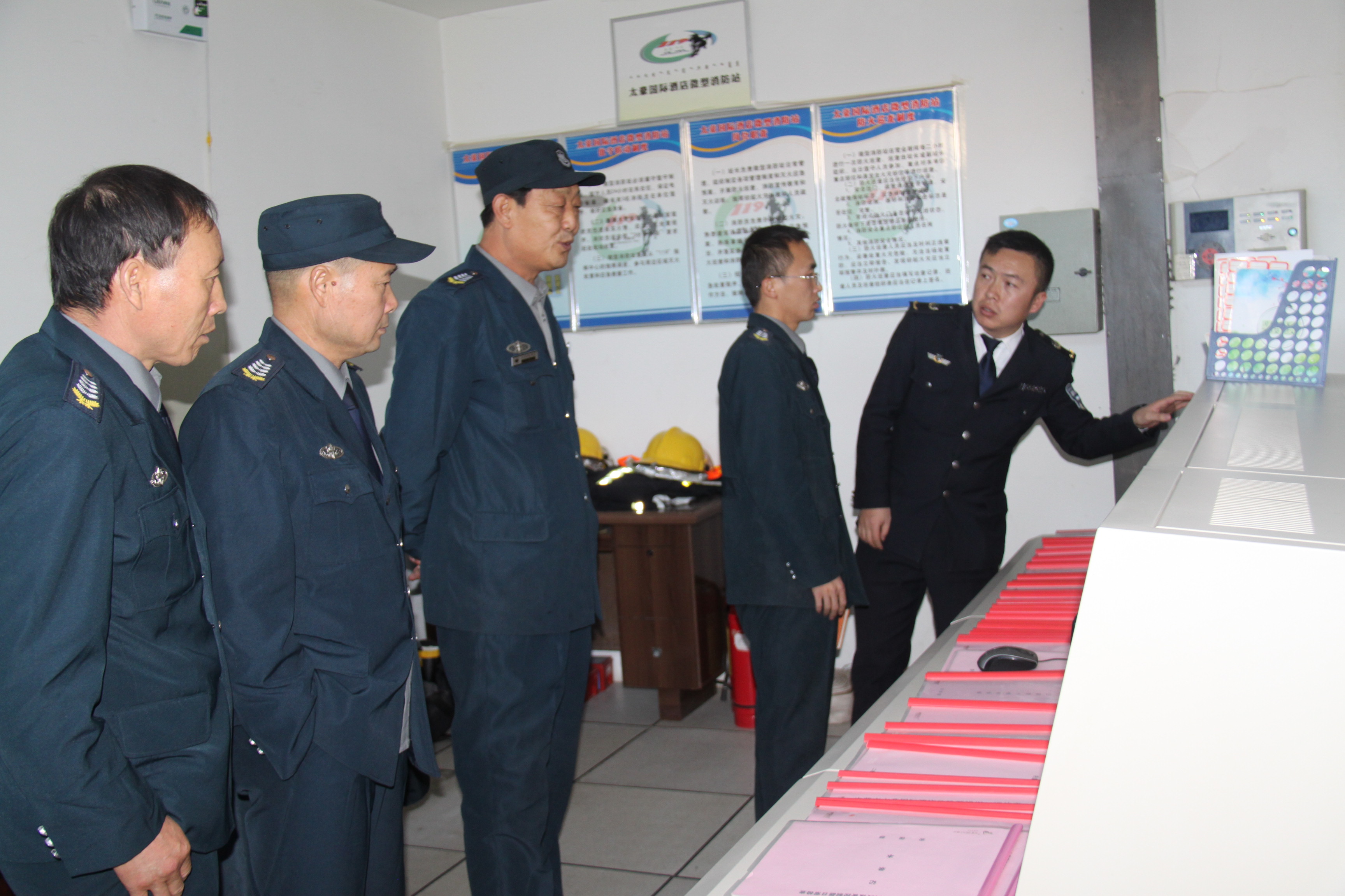 随后,组织工程及安保人员到酒店消防控制室进行了现场授课,主要内容包括:消防控制系统的工作原理、控制面板的操作流程、湿式报警阀的工作原理、喷淋及消火栓系统的操作及运行原理等。