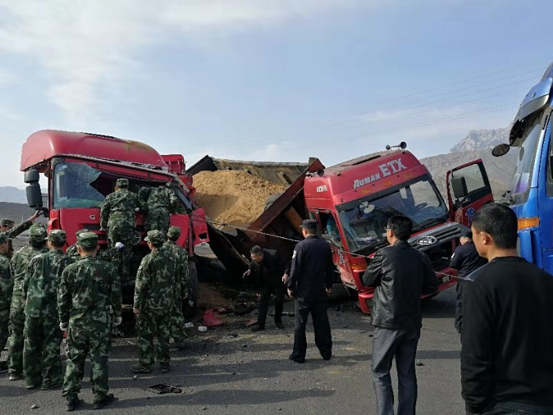 近日,在乌巴公路兴泰煤化公司路口发生一起交通事故,一辆半挂拉煤车和一辆拉土的翻斗车相撞,造成一辆车的司机因驾驶室严重损伤被困车内;矿山救援大队接到事故报警后,值班小队根据事故的性质,携带救援装备,第一时间到达事故现场展开救援。