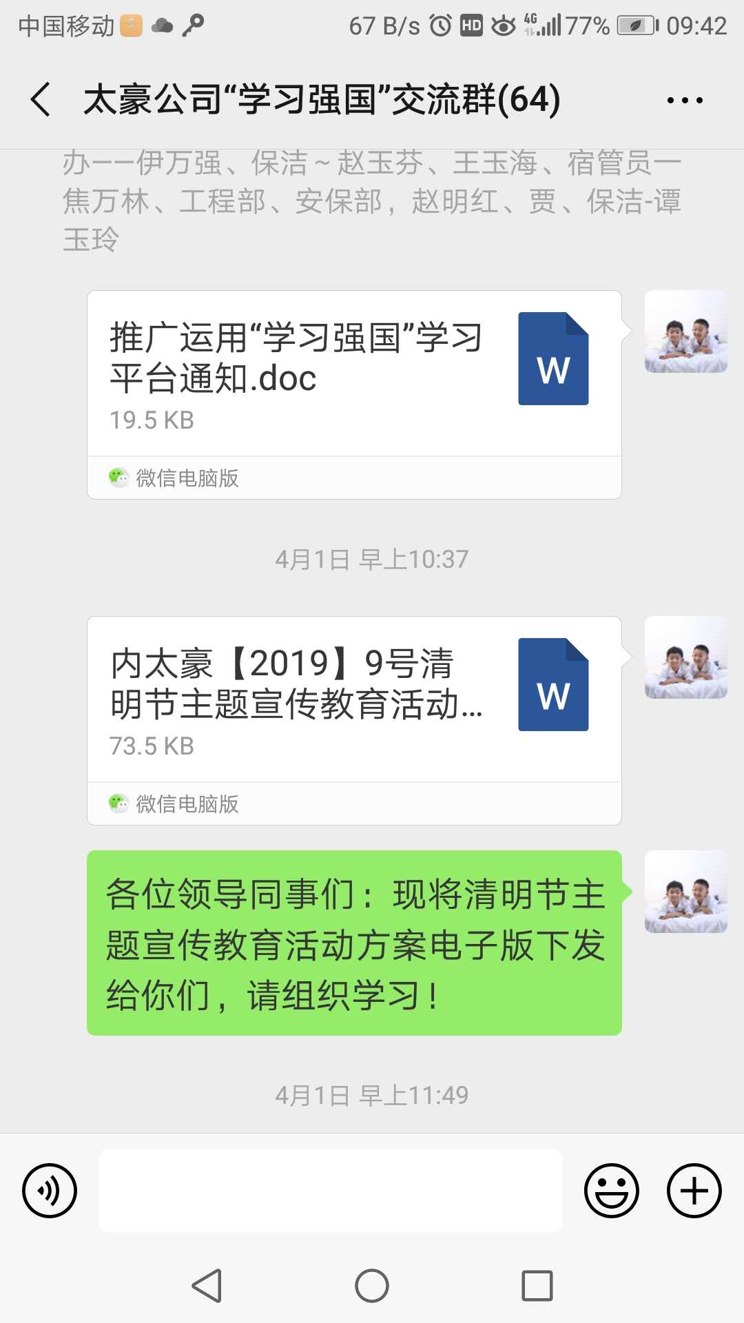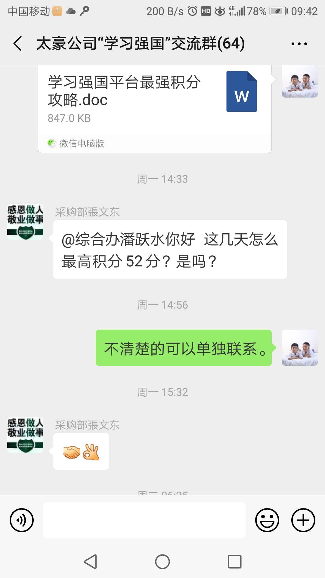 为了方便管理,公司建立了“公司学习强国群”,并制定了周汇总、月通报制度,要求各部门将学习强国本部门人员学习积分情况通过手机截图或者表格形式发送到群,由综合办公室相关负责人进行汇总、通报。