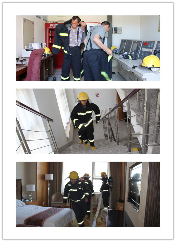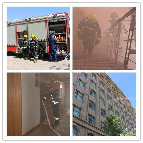 上午10时30分,随着太豪国际酒店消防监控中心消防自动报警系统火灾报警声响起,太豪国际酒店综合灭火疏散演练正式开始。此次演练以模拟酒店5楼509房间着火为情况假想,当消防主机显示客房509房间出现烟感报警后,消防监控中心立即通知当值保安人员和5楼客房人员持通讯工具和灭火器迅速赶到现场查看,在确认火情后就地展开灭火,客房部的其他同伴一边参与灭火,一边疏散客人和员工,组织的有条不紊。消防监控中心在确认火灾后,立即将消防自动报警系统转为自动状态(模拟操作),第一时间拨打了119、120等求救电话。然后向总经理胡生君汇报火灾情况,胡生君总经理得知火灾情况后立即通知各部门负责人启动综合灭火疏散演练预案,同时快速赶到了消防监控中心坐镇指挥。安保部长收到通知后立即呼叫义务消防员、安全员、保安人员集结携带装备器材在2分钟内赶到着火地点展开前期的灭火和救助伤员。消防救援大队赶到酒店后立即组织开展了现场指挥、火情侦察、消防水带铺设、灭火等工作。在消防救援大队和酒店安保人员的共同努力下,大火很快被扑灭。经过清点,酒店所有客人和员工全部安全疏散至后院停车场。及时赶到现场的120急救中心工作人员对部分受伤、昏迷人员进行急救后快速拉往医院救治。