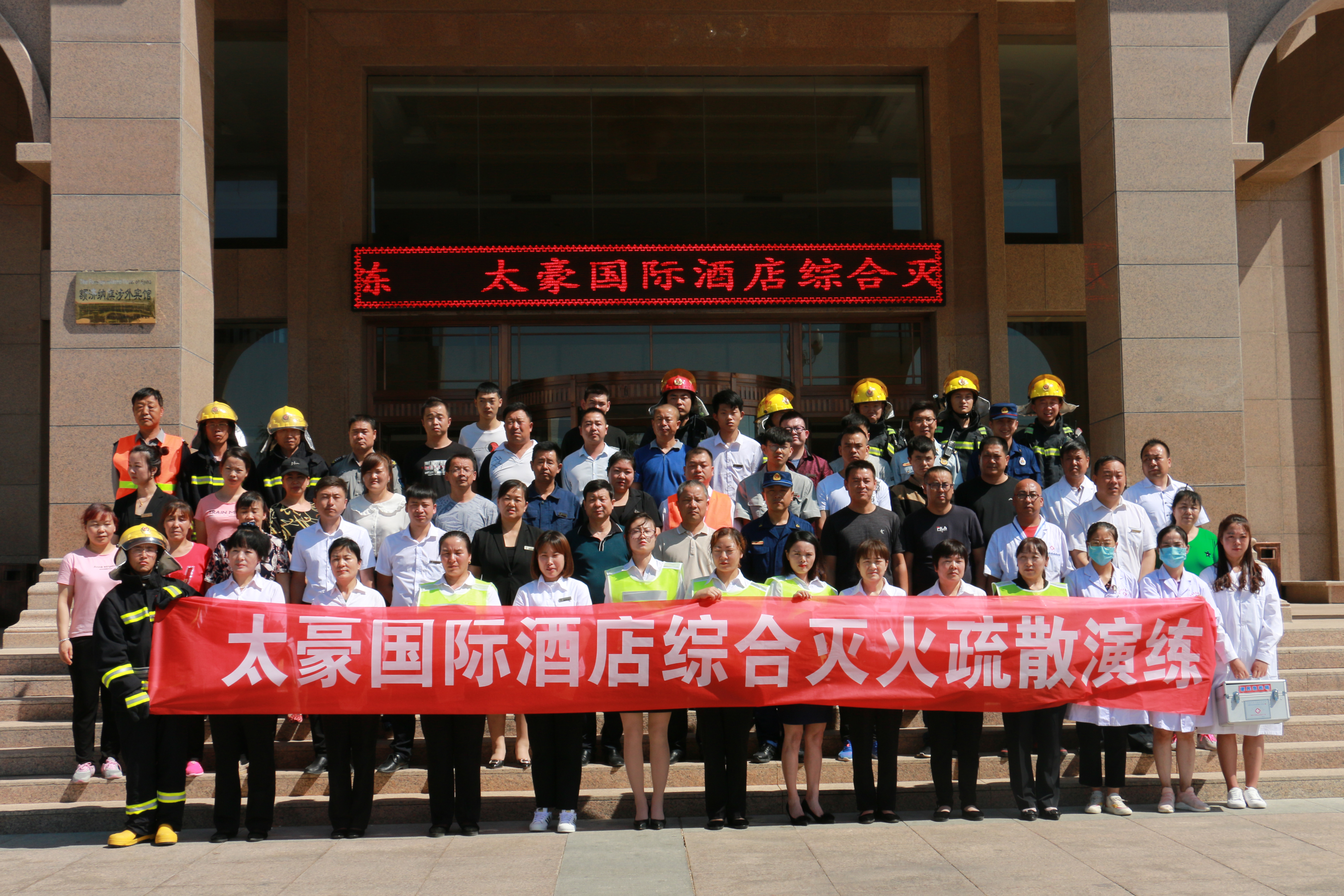 太豪国际酒店总经理胡生君对这次演练活动进行了总结,他代表太豪国际酒店向前来参加演习的各部门领导和人员表示衷心的感谢,对酒店员工在此次演习中的良好表现进行了表扬,希望他们切实提高消防安全意识,为酒店的消防安全工作尽一份力。最后,所有参演人员在酒店楼前合影留念。