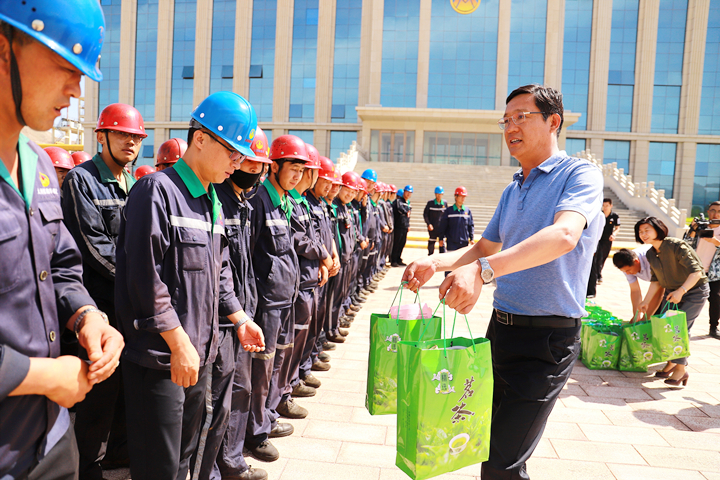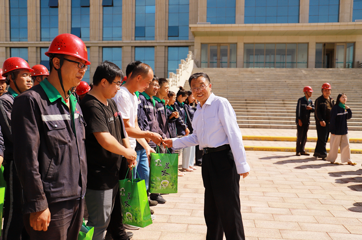7月16日上午,永昌县委副书记赵光学带领县政协副主席张新萍、县总工会常务副主席巩杰虎、县总工会经审委主任李勇,在镇常委副书记李德泰等领导的陪同下,到金昌鑫华焦化公司开展“夏送清凉”活动,向坚守在一线员工发放了茶叶、冰糖、柠檬片、菊花等100份防暑降温“大礼包”。公司领导张萍、杨天云、王书生参加活动。