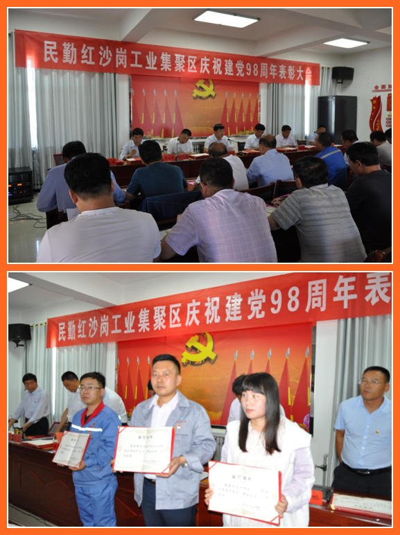 在民勤红沙岗工业集聚区庆祝建党98周年大会上,太西煤民勤实业公司3名同志受到表彰,杨龙同志被授予“优秀共产党员”荣誉称号,庞军相、陈来江两名同志被授予“企业工匠能手”荣誉称号。杨龙同志代表“优秀共产党员”表态发言,展示了工业集聚区各基层党组织和广大党员立足岗位作贡献、尽职履责创先进的时代风采。