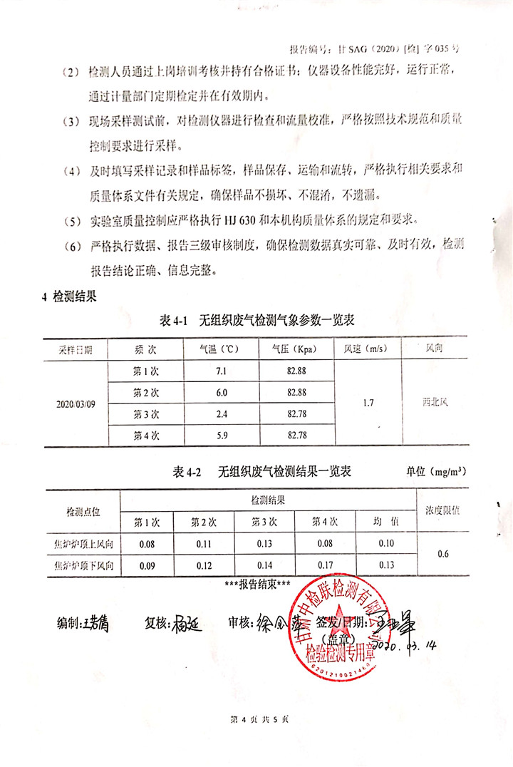 2020年金昌鑫华焦化一季度炉顶废气检测报告公示