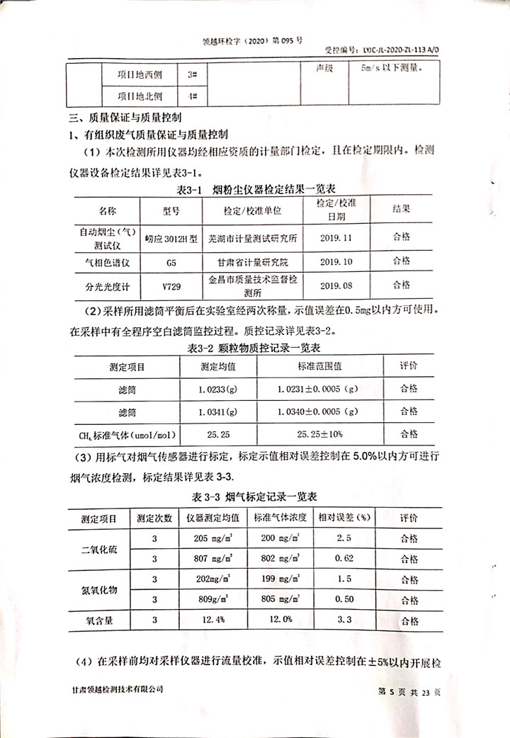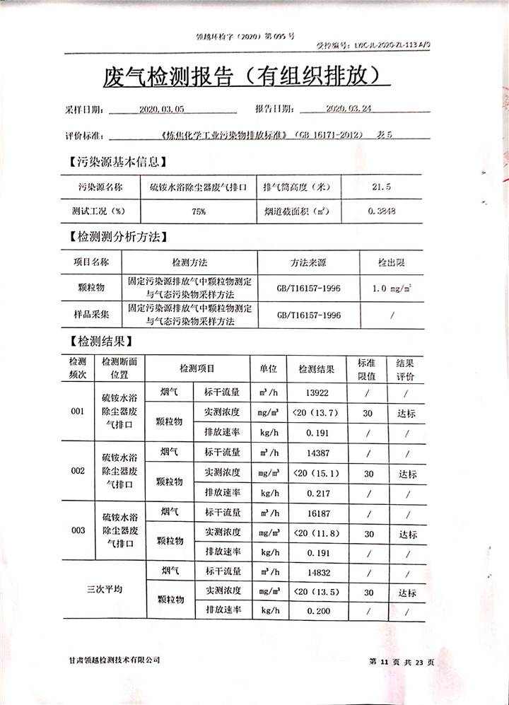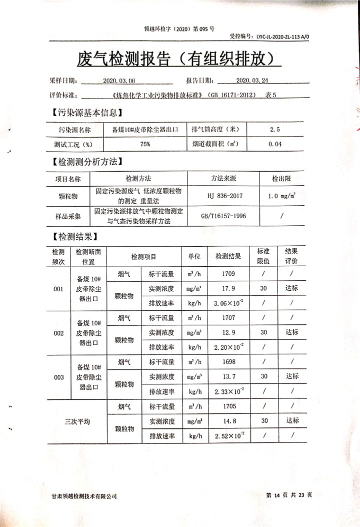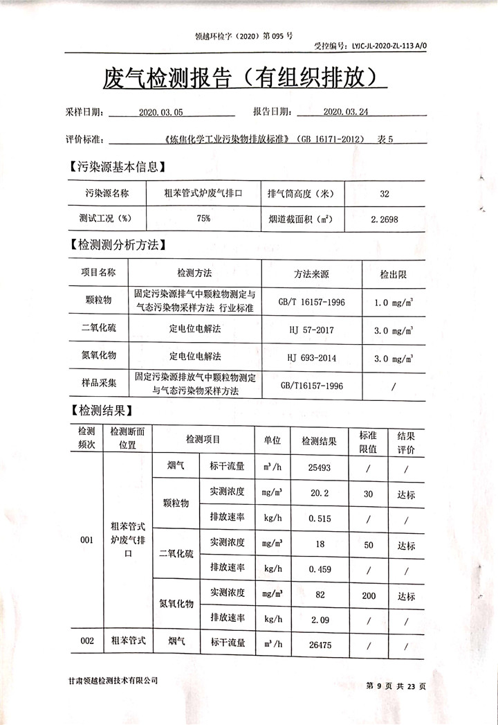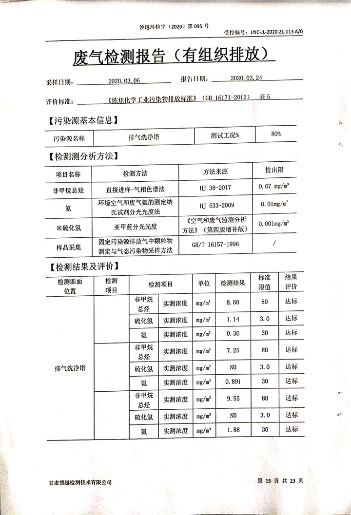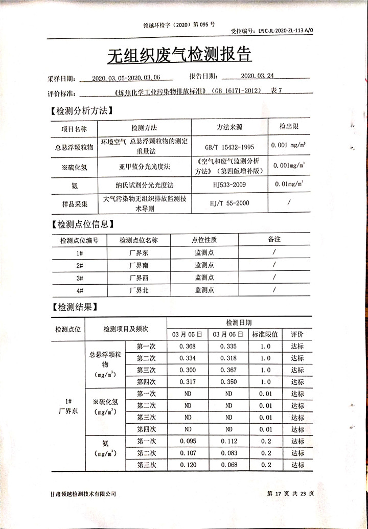 2020年金昌鑫华焦化一季度炉顶废气检测报告公示