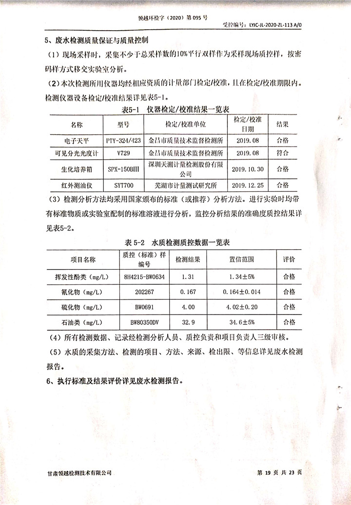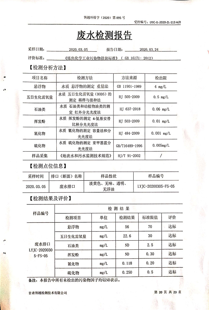 2020年金昌鑫华焦化4月5月水检测报告公示