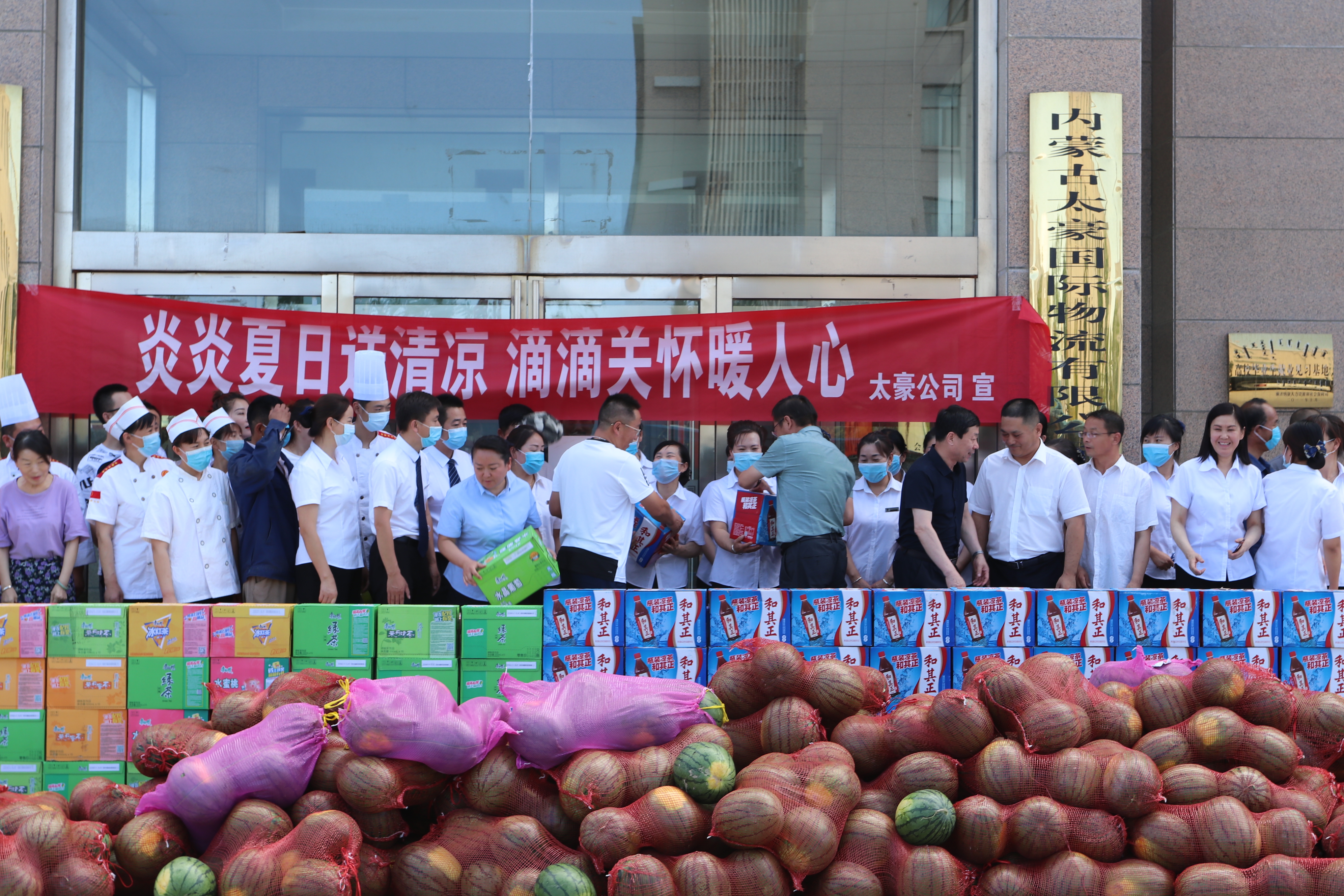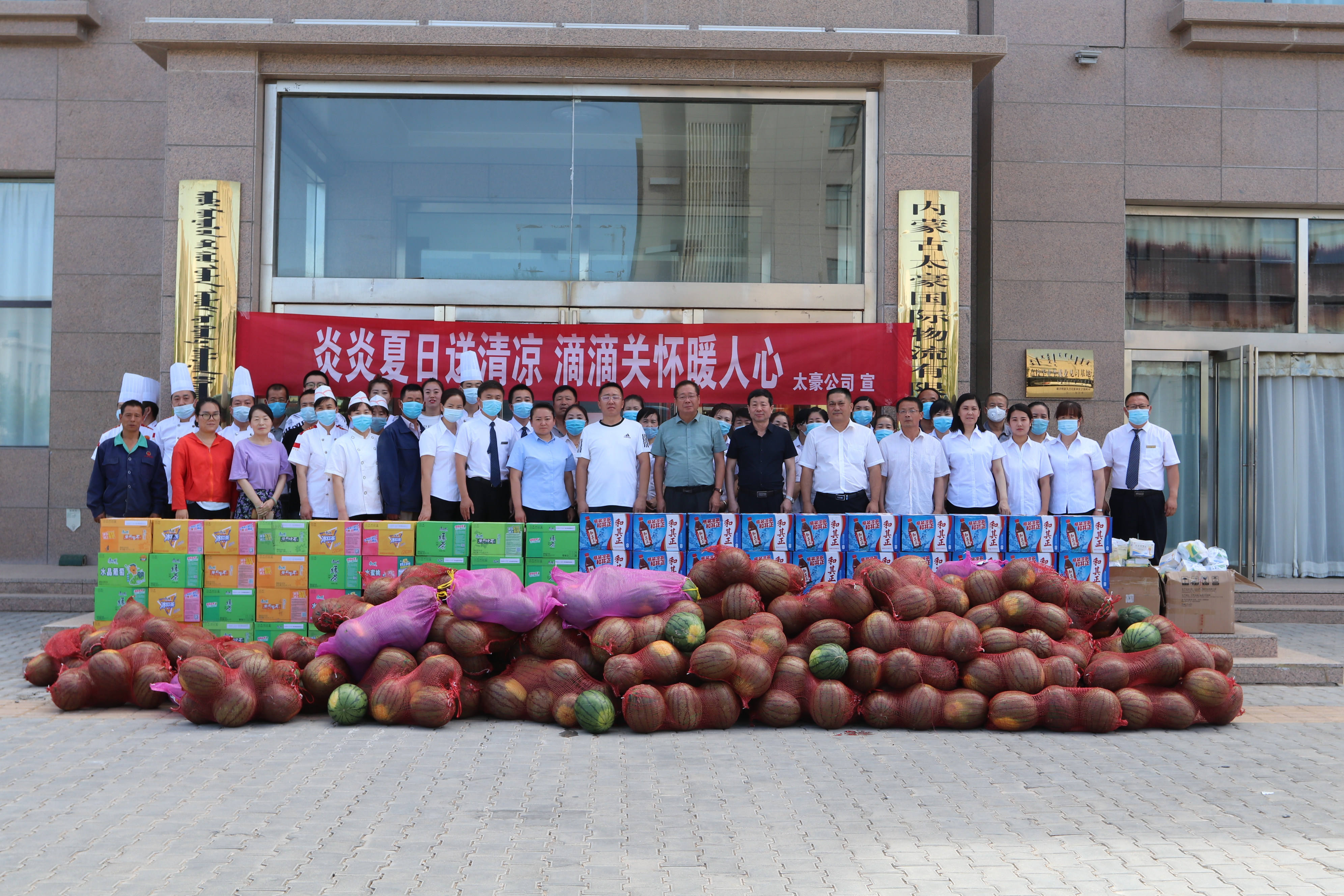 近日,额济纳旗气象局发布了变更高温黄色预警为高温橙色预警信号,额济纳旗大部分地区最高温度将达到37℃以上,部分地区最高气温将达到40℃。太豪公司工会收到高温橙色预警信号后,及时安排工会干事准备防暑降温物品。6月22日上午,在太豪酒店办公楼前,公司总经理张海东、副总经理、工会主席于智、太豪酒店总经理韩霞等领导组织开展了夏季送清凉活动,为一线职工送去组织的关怀和夏日的清凉。此次送清凉活动,共为职工送去6300余斤西瓜,240余箱凉茶和饮料,以及120余份防暑药品。