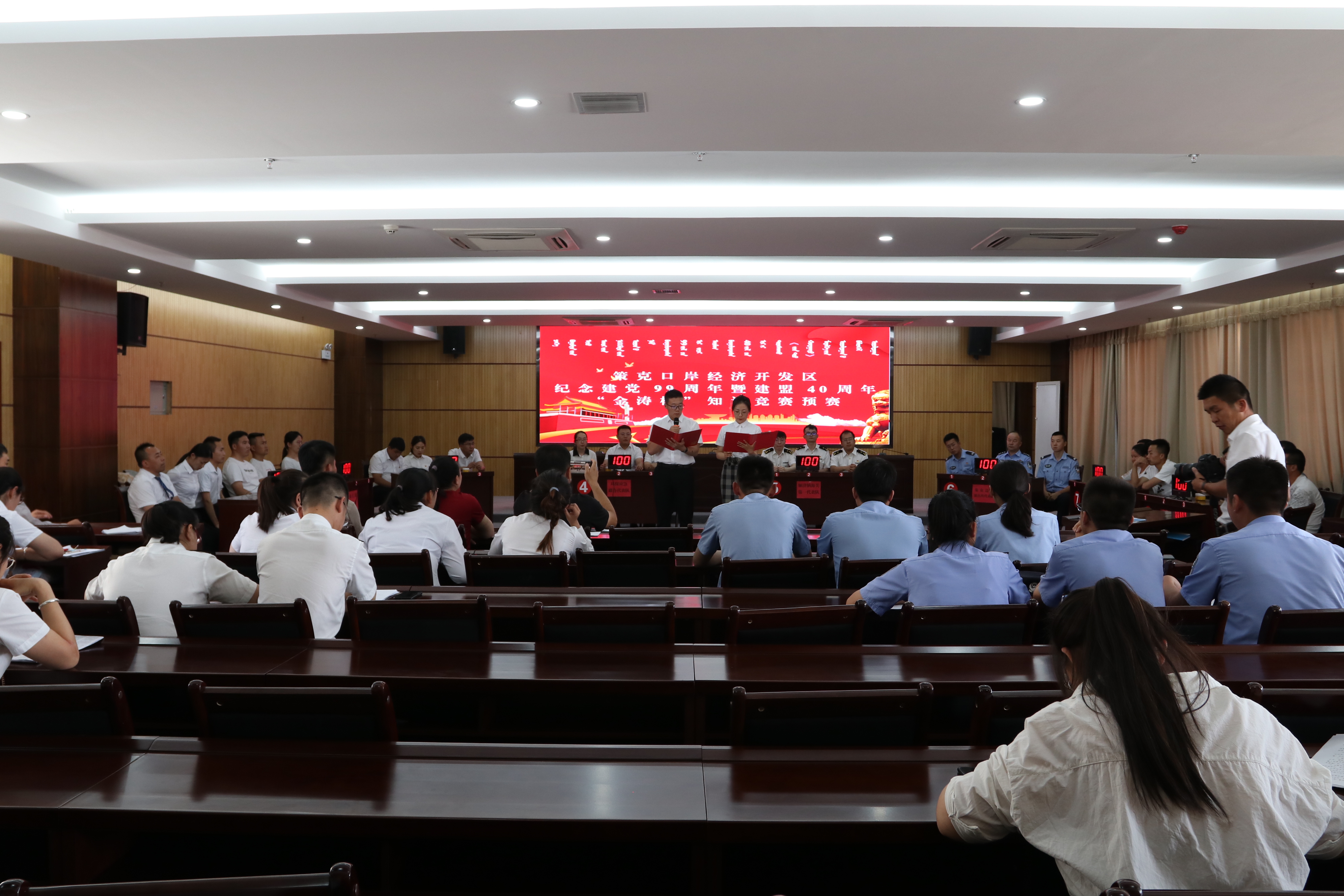 为深入学习贯彻习近平新时代中国特色社会主义思想,不断提高党员干部政治理论学习的积极性和主动性。6月23日-24日,策克口岸经济开发区党工部在大数据中心五楼党员实训中心举办了纪念建党99周年暨建盟40周年知识竞赛活动。 开发区各党支部共选派了24支参赛队参加竞赛活动。