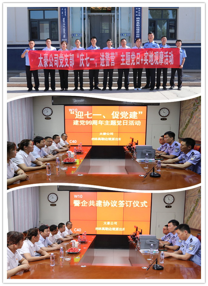 太豪公司党支部本着优势互补、共同发展的目标,主动安排相关人员与派出所党支部取得联系,协商支部共建和庆七一主题党日活动相关事宜。经过协商,双方确定具体日期和活动内容。6月29日下午,太豪公司党支部组织党员同志深入纳林高勒边境派出所开展警企支部共建暨“庆七一,进警营”主题党日+实地观摩活动。通过观看派出所党建宣传片,参观荣誉室、党员活动室、学习室等场所,全方位学习派出所先进基层党建工作经验,努力向全国一流基层党建单位看齐。