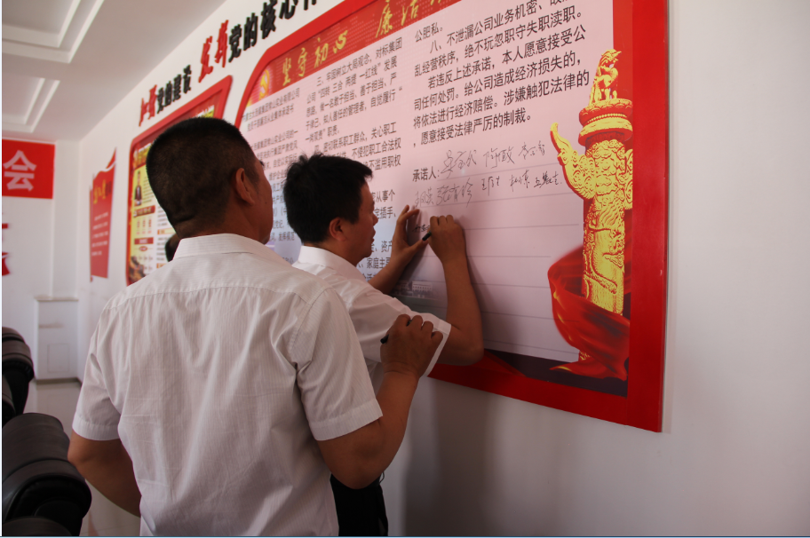 会上,全体党员重温了入党誓词、学习了《中国共产党廉洁自律准则》,党总支书记吴宝斌同志汇报了班子召开组织生活会检视剖析问题情况,通报了征集到总支班子和班子成员意见建议和批评。总支班子成员和参会党员干部分别结合各自的思想认识和具体工作,对照董事长的讲话精神,谈认识体会、谈收获感想。对照部分管理层严重贪腐失职渎职现象、对照下一步重点工作与要求查找了自己的差距不足,明确了努力方向和整改措施。同时,参会人员在《党员干部廉洁从业集体承诺书》展板上郑重地签上了自己的名字,主动接受职工群众的监督,承诺自己在阳光下开展工作。