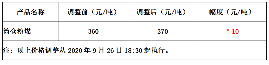 内蒙古满来梁煤矿9月26日上调筒仓粉煤价格10元/吨