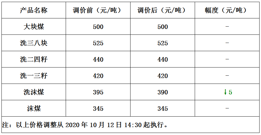 内蒙古铁煤东新公司10月12日下调洗沫煤价格5元/吨