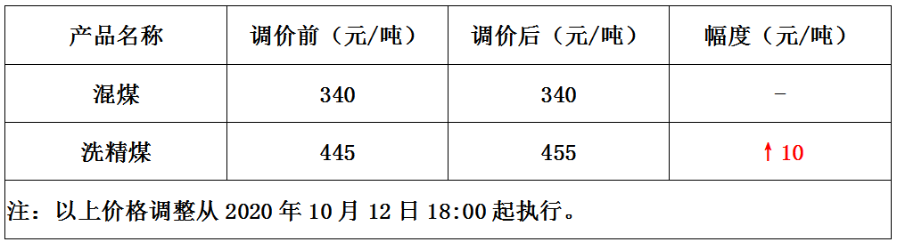 内蒙古蒙大矿业10月12日上调洗精煤价格10元/吨