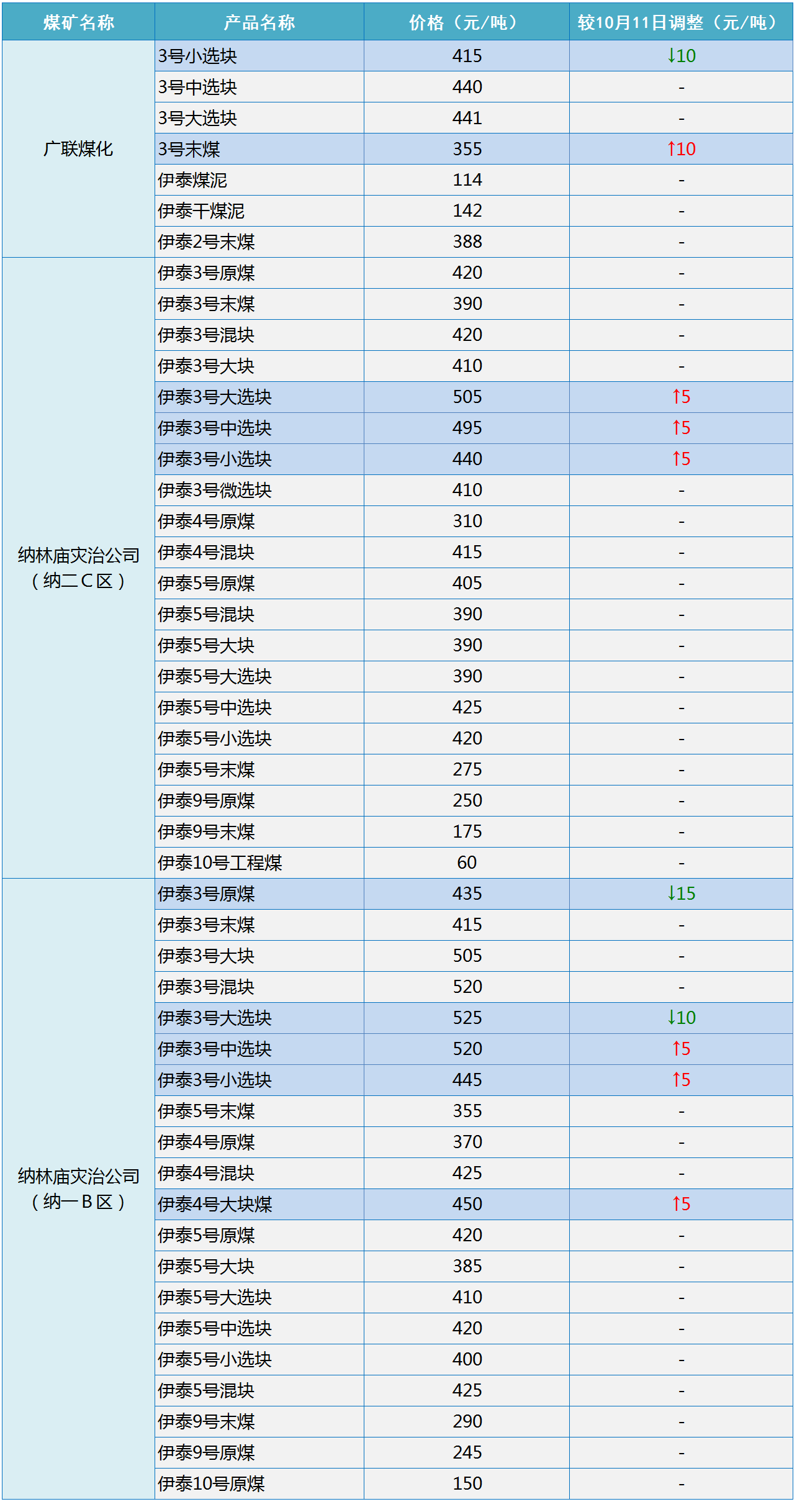 伊泰集团10月12日调整部分煤炭坑口销售价格-15~10元/吨