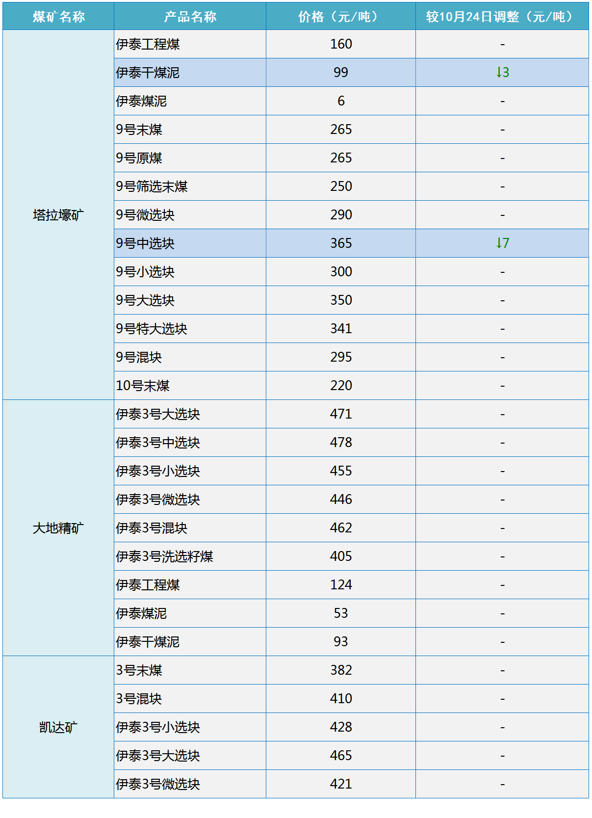 伊泰集团10月25日下调塔拉壕矿部分煤炭坑口销售价格3-7元/吨