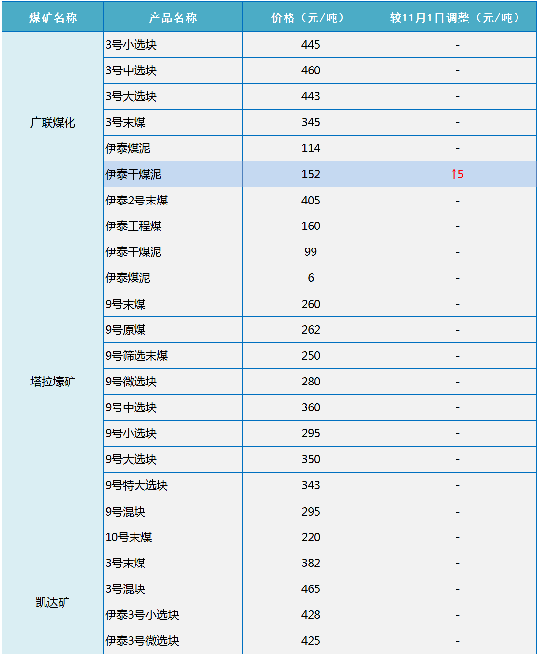根据伊泰集团2020年11月2日18点更新的销售价格显示,伊泰集团上调广联煤化伊泰干煤泥销售价格5元/吨,其他煤矿价格不变,具体如下: